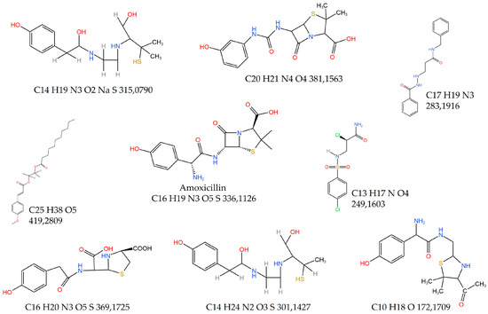 - Nägele, E.; Moritz, R. Structure elucidation of degradation products of the antibiotic amoxicillin with ion trap MSn and accurate mass determination by ESI TOF. J. Am. Soc. Mass Spectrom. 2005, 16, 1670–1676. [Google Scholar] [CrossRef]
