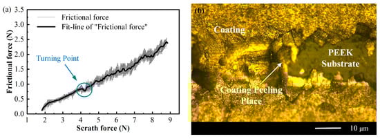 The scratch method was used to characterize the adhesion between the coating and the substrate. Figure 6 shows the results of a scratch test on CF30/PEEK material with Ra of 0.2 μm. Figure 6a shows the friction-normal load curve of the scratch test. It demonstrated that when the load was 4.2 N, the curve had a significant turning point for the first time. Through microscope observation, it is determined that the coating began to peel off when the load was 4.2 N. The location of the peeling part is shown in Figure 6b, so it can be considered that the scratch force at this point was the coating adhesion.