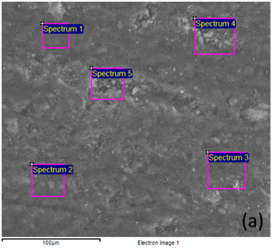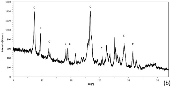 The common chemical formula of the clinoptilolite mineral is well-known and it corresponds to (K2,Ca)3Al6Si30O72.24H2O [20]. Since the EDS technique also provides the atomic percentage (or molar percentage) of the oxygen present in the compound, it is possible to compare the experimentally found mineral stoichiometric composition with that expected for the clinoptilolite by calculating the atomic ratio: , which results: 2.67 (see Table 1). Therefore, a good accordance has been found between experimental and theoretically expected (i.e., 96/(30 + 6) = 2.67) stoichiometric compositions.