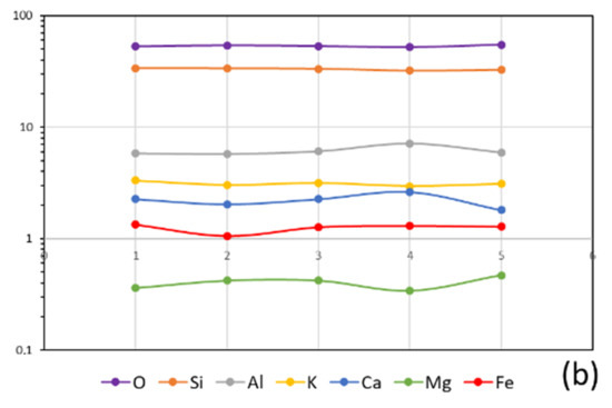 The EDS analysis has been also used to test the homogeneity of the natural sample composition by performing the elemental analysis in different points of the same sample surface (see Figure 2). As visible, the composition data achieved by EDS are mostly consistent (low fluctuation of the measured values), especially for the most abundant elements.