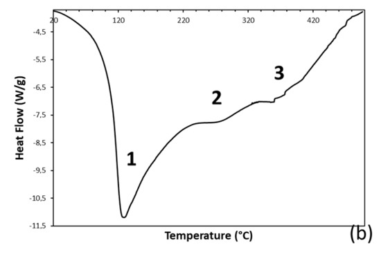 The water contained in the natural clinoptilolite sample has been also qualitatively investigated by using DSC, with the aim to establish the nature of the different water types. The DSC thermogram of the mineral is given in Figure 4b. The very broad endothermic signal visible in the DSC thermogram, which extends from ca. 100 °C to ca. 450 °C, is generated by the desorption of at least three different types of physically adsorbed water molecules (i.e., water molecules adsorbed on the external surface and in the mesoporosity (1), water molecules adsorbed in the super-cages of the microporosity (2), and water molecules adsorbed in the sodalite cages of the microporosity (3)). It is important to observe that water adsorbed on the external surface and in mesoporosity is the most abundant fraction of the total water present in clinoptilolite and it is fully desorbed at a temperature close to 100 °C.