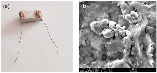 Photograph of the electrically tested sample (a) and SEM-micrograph of the silver electrode surface (b).