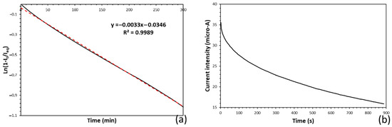 It is possible to establish the type of kinetic control that is active in the adsorption process and to formulate an hypothesis on the involved reaction mechanism, by mathematically elaborating the current intensity temporal behavior shown in Figure 7b. Owing to the current intensity proportionality with the concentration of the charge carriers (i.e., ), the current intensity measurements can be used to calculate the numerical value of the ratio between the carrier concentration at t time and at equilibrium (i.e., ). The complementary value of this ratio corresponds to the unsolvated K+ ions (i.e., ), that become charge carriers only after solvation by water. As visible in Figure 8, the logarithm of this quantity behaves linearly vs. time (a linear best-fitting with a correlation factor R of 0.9989 has been found). As a consequence, the water adsorption process follows a Lagergren pseudo-first kinetic order and, according to the performed linear best-fitting of the experimental data, the specific adsorption rate is 3.3 × 10−3 min−1 at a temperature of 25 °C.