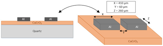 Two-dimensional and three-dimensional representation of Al pads deposited on CuCrO2 thin film used for electrical measurements.