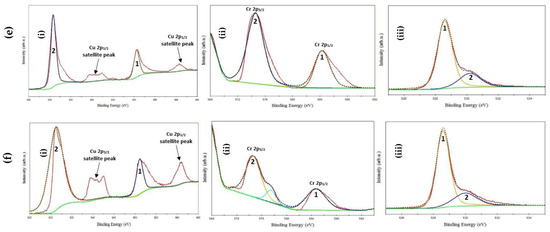From Figure 3(bi), it can be observed that the Cu content in the films sputtered with 10 W of Cu2O sputtering power was not enough to be detected through XPS analysis. This is contrary to the results obtained through XRD analysis, where CuCr2O4 phases were observed. A possible reason for this observation can be attributed to the fact that XPS is a surface analysis technique while XRD is a bulk analysis technique. Hence, XRD analysis was able to identify the CuCr2O4 phase present in the bulk of the film while XPS could not detect any Cu presence on the surface. The main peaks of Cu-2p doublet are Cu 2p3/2 and Cu 2p1/2 (marked by peaks 1 and 2 in Figure 3(bi–fi)). With the increase in the Cu2O sputtering power to 30 W, Cu 2p3/2 and Cu 2p1/2 peaks started showing up clearly in the Cu-2p core level spectrum. However, weak but detectable satellite peaks corresponding to the Cu-2p doublet are also observed at a higher energy level compared to their main peaks. This observation can be seen in Figure 3(ci). This confirmed the presence of Cu2+ species in the film sputtered with 30 W of Cu2O sputtering power. This further corroborates with our findings of XRD analysis where only the CuCr2O4 phase was observed in which Cu has been previously reported to be in a 2+ oxidation state [49,50]. In Figure 3(di), the satellite peaks completely disappear for the film obtained at 50 W of Cu2O sputtering power. This is due to the identification of a single-phase CuCrO2 delafossite structure through XRD analysis in this film. Similar disappearance of satellite peaks in single-phase CuCrO2 thin films have been reported previously [51,52]. Hence Cu can be confirmed to be in a 1+ oxidation state in the film obtained with 50 W of Cu2O sputtering power and the successful formation of a single-phase CuCrO2 delafossite structure in the film. Looking at Figure 3(ei,fi), it can be noticed that as the Cu2O sputtering power is increased further to 75 W and 100 W, satellite peaks corresponding to the Cu-2p doublet start to emerge again and the single-phase structure of CuCrO2 disintegrates. The reason for this can be attributed to the identification of CuO phases. This leads to the confirmation that Cu is present in a 2+ oxidation state as well in the films sputtered with 75 W and 100 W of Cu2O sputtering power.