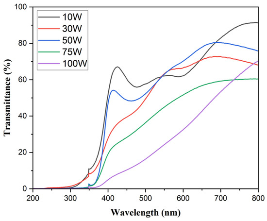 The optical transmission studies were conducted on all the post-deposition annealed films using a UV-Visible spectrophotometer for the wavelength range of 200–800 nm. The deposition of thin films in this research work was conducted on quartz substrates. It is important to note that the results of XRD analysis and the structural changes in the films play a significant role in the transmission data of the films. From Figure 5, it can be seen that when the Cu2O sputtering power is increased, the optical transmission shows a downward trend. The highest optical transmission was obtained for the films deposited with the lowest Cu2O sputtering power of 10 W. This is possibly due to the films being Cr2O3 phase rich as indicated through XPS and XRD results. Additionally, Cr2O3 thin films have been previously reported to have a high optical transmission [57,58,59,60,61]. The lowest optical transmission was obtained for the films deposited with 100 W of Cu2O sputtering power, possibly due to the films being CuO phase rich. The optical transmission of the films gets negatively affected due to the higher sputtering power of Cu2O as the presence of the CuO phase in the film has been previously reported to lower the overall optical transmission of the film [62,63,64]. The highest optical transmission of the single-phase CuCrO2 thin films was identified to be ~81% at 700 nm wavelength obtained for film sputtered with 50 W of Cu2O sputtering power.
