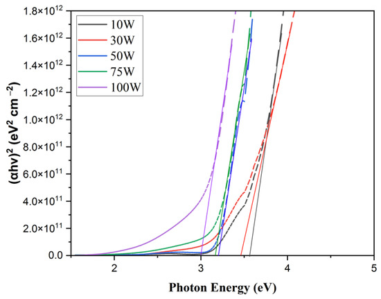 where hν is the photon energy, and ‘n’ denotes the nature of sample transition. It has been reported previously that the value of n equals ½, 2, and 3/2 for direct allowed, indirect allowed, and direct-forbidden transitions, respectively [65,66,67]. However, the films deposited in this research exhibit direct bandgap transition, since the best linear fit of the (αhν) (1/n) versus the photon energy curve was obtained for n = ½. The Tauc plot thus obtained for the films sputtered at different Cu2O sputtering powers is shown in Figure 6.