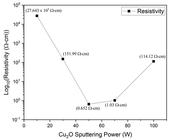 Variation of electrical resistivity with changes in Cu2O sputtering powers.