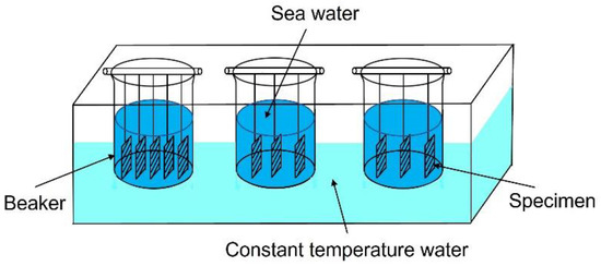The eleven LCC specimens were divided into three groups, group I (specimens No. 0, 1, 2, 3, and 4), group II (specimens No. 5, 6, and 7), and group III (specimens No. 8, 9, and 10). The three groups were put into three separate beakers filled with seawater, and the three beakers were placed in a constant thermostatic water bath, as illustrated in Figure 3. The beakers were filled with seawater (from east China sea in Lingang, Pudong District, Shanghai, China) that was refreshed once a day for 40 days. Then, the specimens were taken out from the beakers for observation with fluorescence microscopy (Olympus Corporation, Tokyo, Japan). After that, the fluorescence images were processed by the ImageJ software for statistical analysis of the microbial attachments. It should be noted that the microbial colonies in the original images obtained from fluorescence microscopy are presented in blue color; they were dyed red with the ImageJ software in order to increase their clarity.