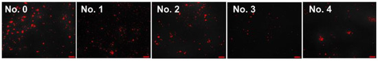 The microbial attachment rates of specimens group I (No. 0, 1, 2, 3, and 4) with different mixed powders of Ni60 and TC4 were observed by fluorescence microscopy. For better observation, the original blue dots in the microbial attachment images were replaced with red dots by the ImageJ software (version 1.8.0), as shown in Figure 4; while the microbial attachment rates are presented in Figure 5. The red dots shown in Figure 4 represent the micro-organisms attached to the surfaces of the specimens.