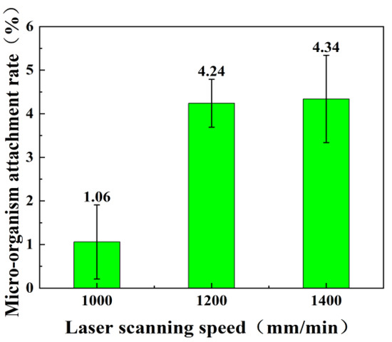 It is observed from Figure 9 that with the same laser cladding mixed powder mass ratio and laser cladding power, the microbial attachment rate on the laser clad coating increases with increasing laser scanning speed in the range of 1000–1400 mm/min. The minimum observed microbial attachment rate is 1.06%, with a laser cladding power of 1000 W, a laser scanning speed of 1000 mm/min, and a Ni60/TC4 mass ratio of 3/7.