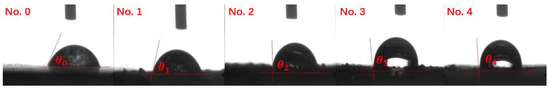 The contact angle measurement on each LCC specimen was repeated 5 times and averaged. Figure 10 illustrates the images of contact angle measurements, while Figure 11a,b present the measured contact angle and surface energy of LCC specimens No. 0–4, respectively.