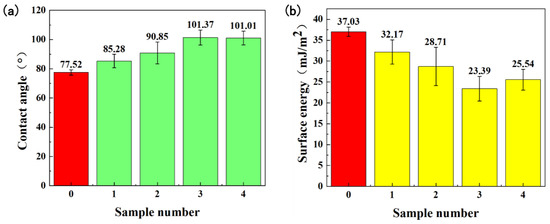 By comparing the measured contact angles and surface energies of LCC specimens No. 0–4, shown in Figure 11, with their antifouling performance, shown in Figure 5, it can be concluded that the contact angles and surface energies of the LCC surfaces are closely related to their antifouling performance and that the surface energy has a more significant correlation with the antifouling performance of the LCC surface than that of the surface contact angle. This would suggest that surface energy can be used as an important control parameter in the design of antifouling LCC surfaces.