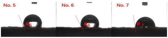 Figure 14 illustrates the contact angle images of LCC specimens No. 8–10, and the measured contact angles are shown in Figure 15a, while the measured surface energies of these specimens are shown in Figure 15b.