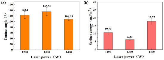 Measured (a) contact angle and (b) surface energy of LCC specimens No. 8–10 with Ni60/TC4 mass ratio of 3/7 and laser cladding power of 1000 W.