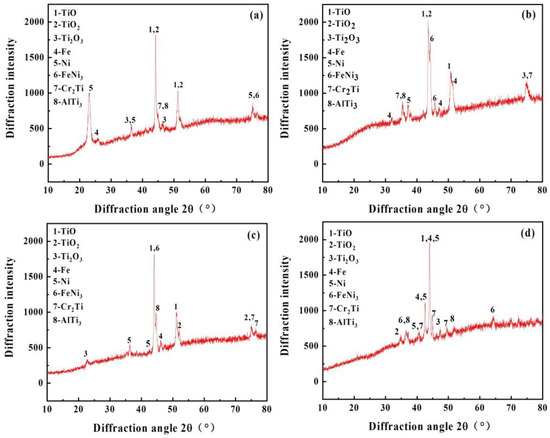 Analysis of phase composition of LCC specimen with various Ni60/TC4 mass ratios (a) No. 1 (pure TC4); (b) No. 2 (2/8); (c) No. 3 (3/7); (d) No. 4 (4/6).