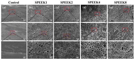 SEM images of FDM-printed PEEK and SPEEK index finger with sulfonation treatment of (a) 0 min (Control), (b) 1 min (SPEEK1), (c) 2 min (SPEEK2), (d) 4 min (SPEEK4), and (e) 8 min (SPEEK8), respectively. From top to bottom, magnifications of 2000×, 4000×, and 10,000× were used.