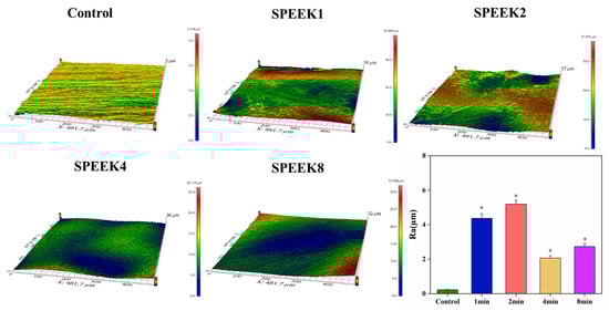 A 3D micro-nanoporous network was formed on the surface of the sulfonated SPEEK, and the sulfonic acid group was introduced on the surface. We found that the porous structure on the surface of the distal phalanx of SPEEK index finger gradually became more pronounced and complex with increasing sulfonation time. A previous study reported that the formation of nanoporous structures on the SPEEK surface was better with increasing immersion time, which is consistent with our findings [39]. In addition, the microporous structure of SPEEK8 showed excessive dissolution, which also agrees with the results of the measured roughness. In another study [17], it was also found that the microporous structure on the surface of the material showed a tendency to dissolve and destroy when the sulfonation time reached 7 min. This was possibly caused by the excessive degree of sulfonation and protonation of PEEK molecules.