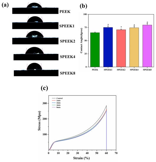 The contact angle of biomaterials is an important indicator that reflects their hydro-philicity, which directly affects the degree of wear of the material surface in the human body. Additionally, the hydrophilicity not only can affect the ability of the implant materials to adhere to proteins and cells in the tissue, but directly promotes the differentiation of osteocytes and the proliferation of osteoblasts. Although PEEK contains a large number of polar hydrophilic groups, ether bonds, and ketone groups, its long molecular chain contains a large number of benzene rings, making it a hydrophobic material. Previous studies have shown that changes in surface morphology and the introduction of sulfonic acid groups can have varying degrees of effect on the hydrophilicity of the PEEK surface. In our study, the contact angles of PEEK and SPEEK corresponding to four groups were measured, and their contact-angle profiles are shown in Figure 4a.