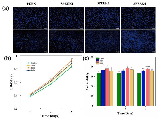 (a) Cells stained with DAPI adhered to the surfaces of PEEK. (b) Cell growth of pure PEEK and SPEEK at days 1, 4, and 7. Upper scalebar: 50 µm; lower scalebar: 100 µm. (c) Cell viability of SHED on surfaces of SPEEKs with different sulfonation times on days 1, 4, and 7 (n = 3, * p < 0.05, ** p < 0.01, and **** p < 0.0001 vs. control group).