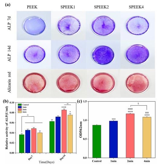 According to the ALP staining (Figure 7a) and its quantitative analysis (Figure 7b), the ALP activity of the SPEEK control group was higher than that of the PEEK group. The results showed that the ALP expression levels of SPEEK were increased on day 7, but there was no significant difference. On day 14, the ALP expression was the highest in the SPEEK2 group and the lowest in the PEEK group, while there was no significant difference between SPEEK1 and SPEEK4.