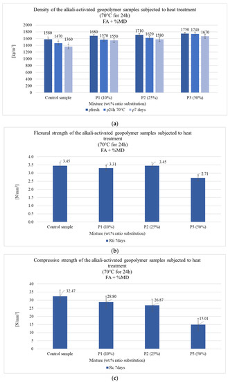 Physico-mechanical performances of the alkali-activated geopolymer binder using MD as FA substitution subjected to heat treatment: (a) Apparent density; (b) Flexural strength and (c) Compressive strength.