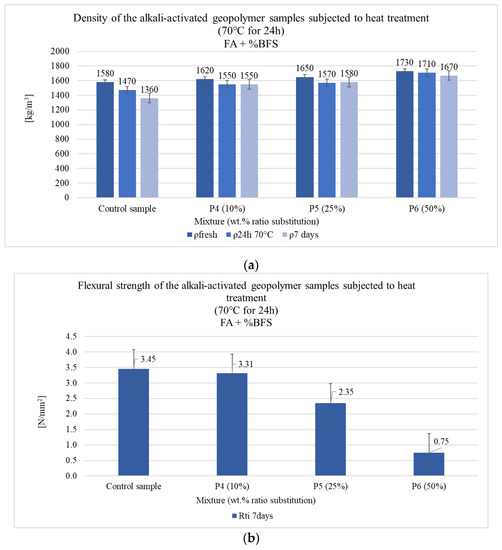The effect of fly ash substitution on alkali-activated geopolymer samples subjected to heat treatment was evaluated on samples P4–P6. The amount of fly ash substituted by blast furnace slag was 10, 25 and 50%. The results in terms of apparent density, flexural strength and compressive strength are graphically presented in Figure 2. All results obtained are compared to the control sample, produced using only fly ash as a raw material in the production of the alkali-activated geopolymer binder.
