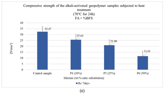 The compressive strength results obtained for samples produced using blast furnace slag as fly ash substitution show the same behavior: the compressive strength of samples subjected to heat-treatment are higher than the ones subjected to laboratory conditions (Figure 6b).