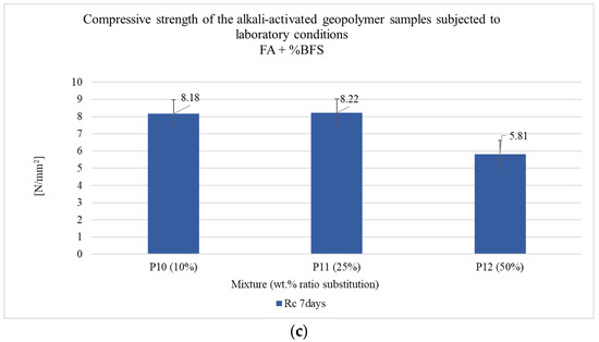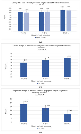 The effect of fly ash substitution on alkali-activated geopolymer samples subjected laboratory conditions was evaluated on samples P7–P9. The amount of fly ash substituted by marble dust was 10, 25 and 50%. The results in terms of apparent density, flexural strength and compressive strength are graphically presented in Figure 3.