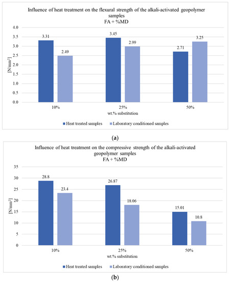 Influence of heat treatment on the mechanical properties of alkali activated geopolymer samples produces using marble dust as fly ash substitution: (a) Flexural strength and (b) Compressive strength.