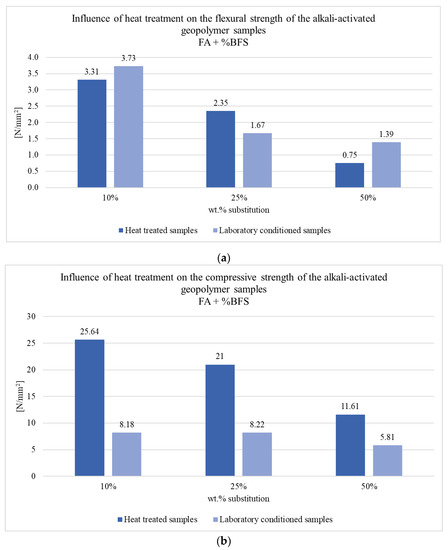 Influence of heat treatment on the mechanical properties of alkali activated geopolymer samples produces using blast furnace slag as fly ash substitution: (a) Flexural strength and (b) Compressive strength.