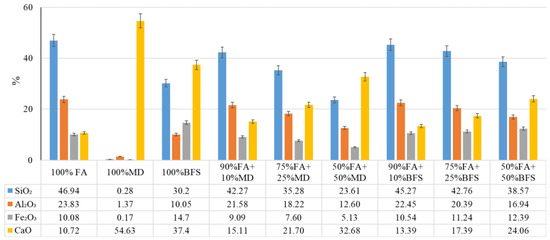 Geopolymer binder chemical composition for different mixtures (wt.%).