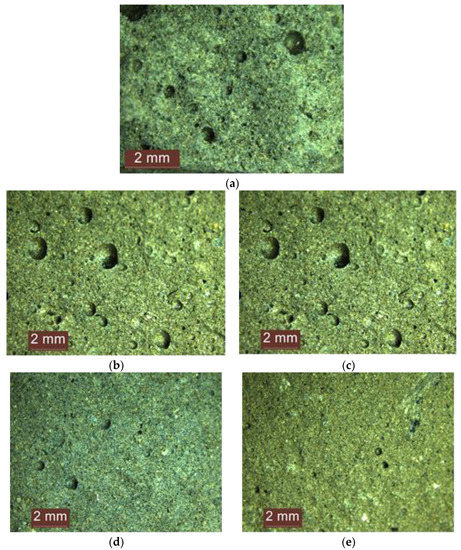The microscopic analysis (Figure 9) was performed using a Leica DNC2900 optical stereomicroscope, at 1× magnification, aiming at possible changes in terms of pore size and distribution in the composite matrix, as well as its homogeneity.