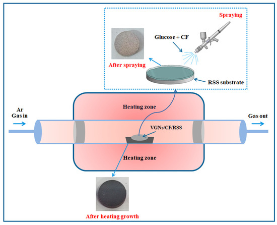 A schematic view of the preparation of VGNs/CF by a facile thermochemical growth method is shown in Figure 1. The VGNs/CF composite films were obtained as follows: 1 mg CF powder was homogeneously mixed with glucose solution at a set concentration to form the precursor solution that was subsequently applied onto the surface of the RSS substrate. The obtained sample was dried at 60 °C for 30 min and then transferred to the central heating zone of a quartz tube furnace, where it was heated at 5 °C/min to 850 °C for 3 h, after which it was naturally cooled to room temperature to obtain the VGNs/CF composite films.
