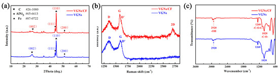 The prepared VGNs/CF composite film and pure VGNs film were further characterized by the FT-IR spectra, and the results are depicted in Figure 2c. In detail, for both samples, the peaks at 2920 cm−1 are attributed to the stretching mode of the hydroxyl groups (-OH). The peak located at 1020 cm−1 is assigned to the stretching vibration of the -C-O- groups, while the peak at 1260 cm−1 is attributed to the stretching vibration of the -C-O-C- groups [51]. These findings suggested that at least three functional groups of -OH, -C-O-, and -C-O-C- were successfully introduced in the films prepared by the two precursors under the experimental conditions. The presence of -OH, -C-O-, and -C-O-C- in the FT-IR spectra proves the successful generation of graphene from another point of view. In addition, the presence of oxygen-containing functional groups proves that the resulting graphene has been oxidized, but theoretically, completely oxygen-free graphene does not exist.