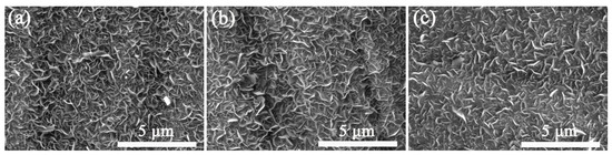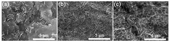 Effect of growth time on the surface morphology of the VGNs/CF composite films obtained by heating 0.4 g/mL glucose precursor solution at 850 °C for different times was further investigated. After growing for 3 h (Figure 6b), the VGNs in the composite films grew more densely and uniformly, with a clearer vertical morphology. In contrast, the morphologies of the VGNs/CF composite films showed relatively poor growth after 2 h (Figure 6a) and 4 h (Figure 6c), and the vertical structure of the VGNs on the surface of the composite films could not be presented clearly. According to the results, 3 h is the optimal growth time for the VGNs/CF composite films at 850 °C in the tube furnace.