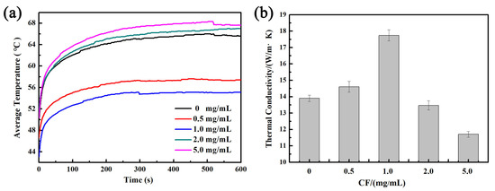 To demonstrate the surface heat dissipation of the VGNs/CF composite film, the VGNs/CF composite films were placed on a heating plate preheated to 80 °C and heated uniformly for 10 min. The changes in the average surface temperature of the VGNs/CF composite film with time were recorded using a thermal infrared imager at 25 °C, as shown in Figure 8a. The results showed that the average surface temperature of the composite film increased with time to 54.3 °C and remained stable when the CF concentration was 1.0 mg/mL. At the same time, the temperature of the VGNs/CF composite film with 1.0 mg/mL CF was the lowest compared to other composite films, showing the best heat dissipation and stable performance. With the concentration increase in CF from 0.5 to 5.0 mg/mL, the through-plane thermal conductivity of the VGNs/CF composite film shows a trend of first increase and then decrease (Figure 8b). When the CF concentration is less than 1.0 mg/mL, CF is dispersed in the film, and the laps of graphene nanosheets are not completely connected by CF. Thus, there is still a part of the laps where heat transfer is blocked, thus not effectively contributing to thermal conductivity. With increasing the CF concentration, a heat conduction network is formed between the CF and VGNs, which forces heat to pass through the CF quickly, avoiding the influence of the microgasbags. When the CF concentration was 1.0 mg/mL, the through-plane thermal conductivity was as high as 17.7 W/(m·K). However, the excess CF (>1.0 mg/mL) is easily entangled and agglomerated due to van der Waals forces, leading to the heterogeneous distribution of CF in the composite films, which results in the decrease in thermal conductivity [26]. The above results reveal that 1.0 mg/mL CF significantly guarantees the formation of the continuous thermally conductive network, which is an appropriate concentration for the ideal heat dissipation performance of the VGNs/CF composite films.