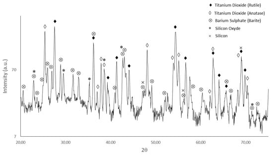 After heating treatment and cooling of the treated material, this powder was sucked up using an ash vacuum cleaner. The powder was then sieved with 1 mm mesh to re-move any residues of glass or photovoltaic cells accidentally aspirated. The resulting particles, as can be observed from SEM observation in Figure 1, were characterized by sub-micrometric dimensions and spherical shape. XRD analysis performed on the particles (Figure 2) evidence the presence of titanium dioxide, both in the forms of rutile and anatase, but also other compounds such as barium sulphate, silicon and silicon oxide are present, as can be predicted due to the fact that the particles are recovered from PV wastes.