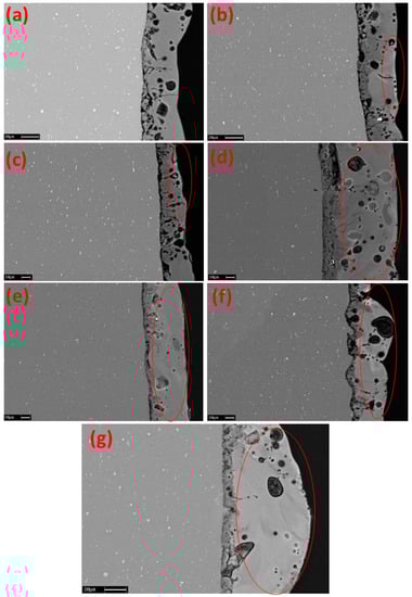 SEM micrographs of the cross sections of the various PEO treated samples: 0 g/L (a), 5 g/L (b), 10 g/L (c), 20 g/L (d), 40 g/L (e), 60 g/L (f) and 80 g/L (g).