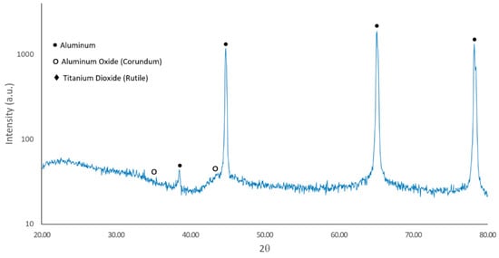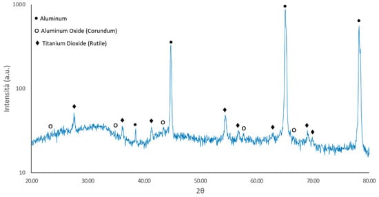 The successful incorporation of the particles during the PEO treatment is also demonstrated by the XRD analyses reported in Figure 6 (sample 0 g/L of particles) and Figure 7 (sample 80 g/L of particles). Comparing the two spectra, it can, in fact, be noted that in the sample obtained with 80 g/L of particles the rutile peaks are clearly observable, as well as those of alumina (from the PEO coating) and aluminum (from the substrate). In the sample obtained without particles the rutile peaks are not visible. By comparing the spectrum of Figure 7 with the one related to the particles shown in Figure 2, it can be observed that, following the incorporation, the crystalline form of anatase, which was instead present in the particles, is no longer visible in the coating. In fact, only rutile is visible in the PEO coating. This is due to the fact that the high temperatures reached during the PEO treatment (even if only locally and for the short duration of the discharges) cause the transformation of anatase into rutile. In fact, this transformation generally takes place at temperatures around 900 °C–1000 °C [37], decidedly lower than those locally reachable during the process of formation of the PEO discharges (about 1800 °C–2370 °C [36]). This transformation is not favorable for obtaining surfaces with photocatalytic characteristics, since the photocatalytic effect of anatase is greater than that of rutile. The fact that the PEO treatment produces the transformation of anatase in rutile is, however, of high scientific interest, because it is indirect proof of the temperatures reached during the PEO treatment.
