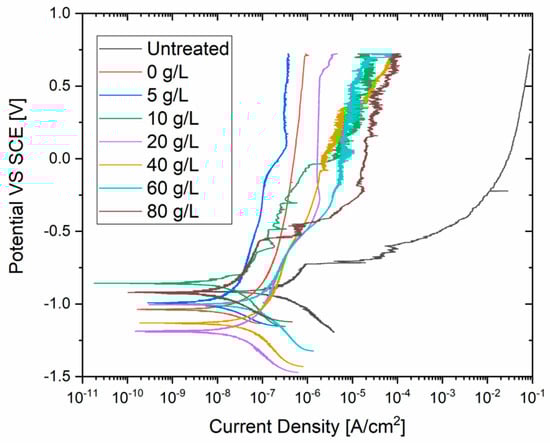 The corrosion resistance of the coated samples was also evaluated through potentio-dynamic polarization tests and the results are presented in Figure 8. First of all, it can be observed that all the coated samples are characterized by a higher resistance to corrosion than the uncoated sample since, following the treatment, a marked drop in the corrosion current and therefore in the corrosion rate is observed. On the other hand, a definite trend that links the quantity of particles with the corrosion properties is not observed. In fact, all the samples treated with the presence of titanium dioxide particles show a behavior similar to each other and similar to that of the PEO treated sample without particles, in terms of corrosion current density. This can be connected to the fact that, as observed from the SEM images, the presence of the particles does not lead to large microstructural or morphological variations in the coating, thus not involving substantial variations in the corrosion behavior. Moreover, as previously observed, the titanium dioxide particles do not fill the pores that characterize the PEO layer, thus not improving the corrosion resistance. The effect of the particles’ addition on the corrosion properties is, in fact, strongly related to the microstructural changes that they produce in terms of densification of the coatings. When the presence of the particles does not lead to coating densification, the corrosion properties can remain un-modified or can even be reduced [38].