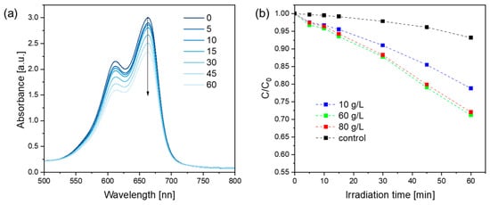 (a) Variation of MB absorbance spectra with irradiation time in presence of PEO 60 g/L; (b) photocatalytic degradation of MB as a function of irradiation time for different PEO samples and for the control experiment (UV light, no sample).
