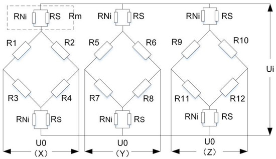 The X and Y directions are symmetrical, and two pieces of feather strain gauge are pasted, respectively, totaling four pieces. A single feather strain gauge contains two independent resistance wires, so two pieces can form a set of full bridge circuits. Where R1 and R4 are stretched as a positive strain, R2 and R3 are compressed as a negative strain, thus forming a Wheatstone bridge for measuring the X direction. Similarly, bridge formation in Y direction and X direction is the same. R5 and R8 are stretched as a positive strain, and R6 and R7 are compressed as a negative strain, but the direction is orthogonal to the X direction. In the Z direction, two groups of strain gauges are connected in a series to form a group of bridge arms. R9 and R12 are pasted vertically and compressed after being stressed, R10 and R11 are pasted horizontally and stretched after being stressed, and four rectangular strain gauges are pasted in the Z direction to form the full bridge circuit. The advantage of the sample arrangement is that the vertical stress measurement is more uniform. RNi and RS are temperature compensation resistance and zero adjustment resistance, respectively. After the completion of the strain gauge pastes and electric bridge connection, the outer end of the sensor is sealed with silicone to protect the measuring circuit.