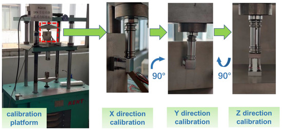 When the sensor is produced, the range, sensitivity, repeatability, and other parameters are determined, which can be obtained by calibration. The relationship between the deformation of the elastomer and the measuring circuit is almost linear. Some interference can be eliminated by the decoupling matrix method. The laboratory gravity acceleration is 9.794 m/s2, and the standard weight calibration platform is used for the static calibration of the strain sensor. The sensor calibration process is shown in Figure 4. Firstly, the sensor is fixed horizontally on the special bracket, and the X direction is vertically downward, and the side of the sensor is attached directly below the loading boom. The weight is increased step-by-step by 100 N, and the relationship between the load and A/D conversion voltage is obtained through the data acquisition system. Then, the sensor was rotated 90° horizontally to obtain the calibration data in the Y-direction in the same way. After the XY direction measurement is complete, place the sensor vertically with the top surface close to the boom and calibrate the Z direction.
