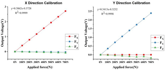 Calibration results are shown in Figure 5. Because the XY direction is symmetrical, the curve shape is almost consistent with the data. When the maximum load is 700 N, the output voltage of the XY direction sensor is about 2.521 V, and the output voltage of the Z direction is about 1.213 V. The linearity of the three directions was excellent.
