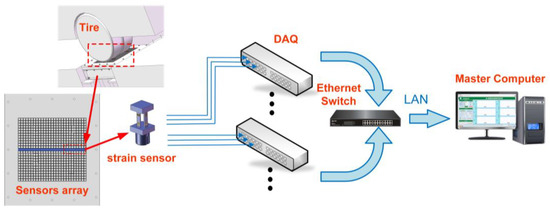 The master system architecture of the measurement is shown in Figure 6. The master system consists of sensor array and acquisition system. Each sensor can measure three directions and contains three channels. A total of 81 measurement channels are required for 27 sensors. There are 27 sensors arranged in a straight line, as shown in the purple square in Figure 6. The other parts are support pins simulating asphalt pavement. The sensors are made of metal, and the friction coefficient of their surface is quite different from that of the asphalt pavement. The sensor array is fixed by the frame and is horizontal with the surface of the pavement. A shielded cable is used to connect the sensor and the acquisition system. Because of the large number of sensor channels, data acquisition is carried out by grouping method. A single chassis consists of eight acquisition cards, and one acquisition card can collect eight signals, and each card uses a high-speed Gigabit Ethernet protocol. The acquisition card has a flash memory, and when the data is blocked, it still saves the data and uploads it after the network is restored.