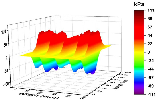 It can be observed from Figure 8 that the sensor data is consistent, and the tire is in good contact with the sensor. The 3D image reflects that the longitudinal stress changes in a sinusoidal trend, and the driving direction is specified as positive. By combining Figure 9, Figures 11 and 13, it can also be seen that the contact shape of the tire path in the free rolling state is approximately a rounded rectangle with a slight bulge in the middle. The stress on both sides is more concentrated than the middle position of the contact surface. The contact stress between the tire and pavement surface is divided into longitudinal stress, lateral stress, and vertical stress. The left front wheel is selected as the experimental wheel. The minimum is about −97 kPa, as can be seen in Figure 9. The positive FX area of the whole contact surface is greater than the negative Fx area, and the maximum positive value is much greater than the negative direction. Thus, under the condition of uniform tire rolling, the forward stress of the pavement surface is greater than the backward stress, and the asphalt is squeezed, leading to the push between the surface layer and the base layer. If the local asphalt is unstable, it is easy to form irregular uplift deformation.