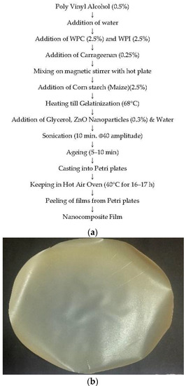 (a): Flow diagram for preparation of optimized nanocomposite film; (b): Corn starch (Maize) + WPC & WPI + PVA + carrageenan + glycerol + ZnO (active film).