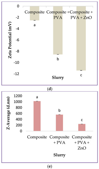 The zeta potential of the composite, the composite with PVA, and the composite with PVA and ZnO nanoparticle slurry is shown in Figure 2d. The zeta potential of the composite slurry, the composite with PVA slurry, and the composite with PVA and ZnO nanoparticle slurry ranges from −2.52 mV to −11.40 mV. Sonication has been proven to be a good method for the dispersion of nanoparticles in the slurry. There was a significant difference (p < 0.05) between all the samples. Similar findings were reported by Qi et al. [24] and Marsalek [25], who found that the zeta potential is a measure of the magnitude of the electrostatic or the charge repulsion/attraction between particles. Furthermore, this is one of the fundamental parameters known to affect stability. In addition, a lower value shows a higher van der Waal attraction, which causes aggregation and thus instability [26].