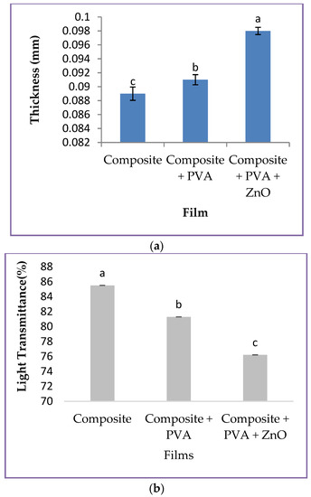The light transmittance of the composite film, the composite with PVA film, and the composite with PVA and ZnO nanoparticle film ranged from 76.21 to 85.51 per cent. The light transmittance of the composite film, the composite with PVA film, and the composite with PVA and ZnO nanoparticle film is shown in Figure 3b. Due to the addition of PVA and ZnO to the films, the thickness increased, which resulted in a decrease in light transmittance. The light transmittance values differed significantly (p < 0.05) for all the samples. Similar results were observed by the Yang et al. [30] and Atta et al. [31].